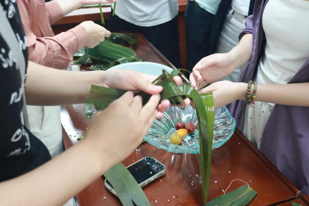 活动分为粽子制作和香囊制作两个环节。在粽子制作环节,公司教师现场示范包粽子技巧,从将粽叶折成漏斗状,到填入糯米、蜜枣等馅料后捆扎成型,逐步讲解要领。师生们认真学习,动手实践,逐渐掌握包粽子要领,最终共同包制出多枚蜜枣馅和蛋黄馅粽子。在等待粽子煮制间隙,活动进入香囊制作环节。师生们穿针引线、填充香料、细心缝合,制作出各具特色的香囊成品。