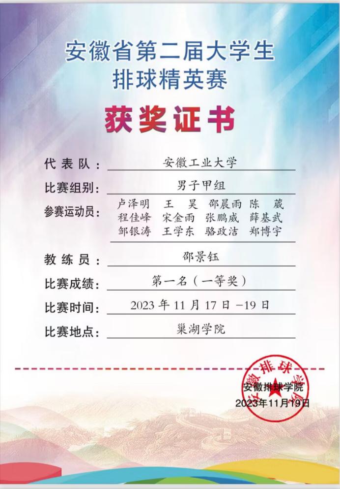 11月17日至11月19日,公司排球队受邀参加安徽省第二届排球精英赛,其中公司邵晨雨、程佳峰、宋金雨、骆政洁、郑博宇5位同学随校队出行,并获得安徽省第二届排球精英赛男子甲组第一名的好成绩。