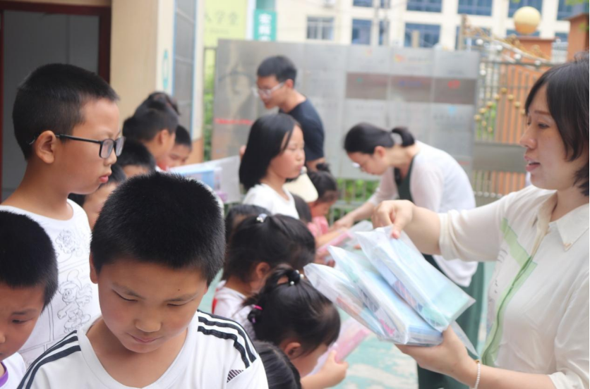 图为赵颖老师为留守儿童们分发学习用品