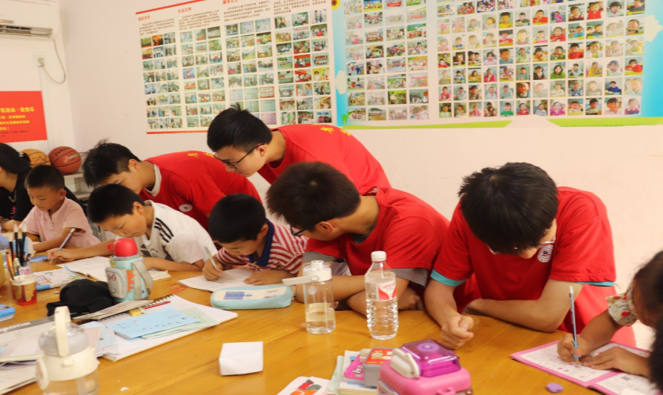 图为团队成员辅导留守儿童功课