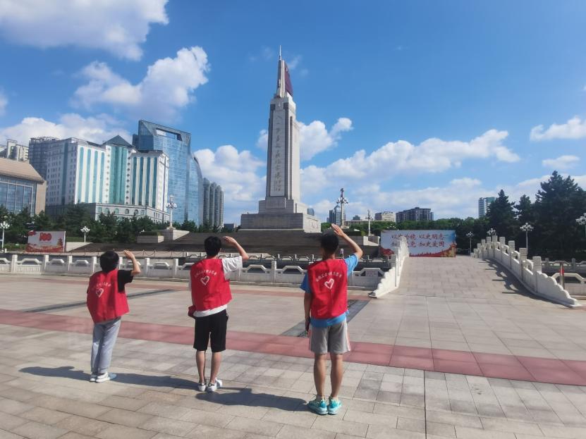 图为实践队员瞻仰“八一”起义纪念碑并重温入团誓词