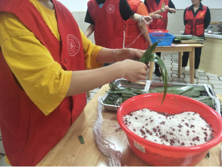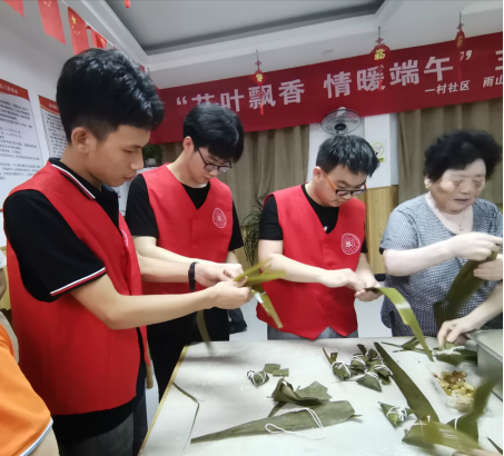 活动伊始,志愿者们提前悬挂横幅,准备包粽子的原材料,了解了粽子的各种制法以后,在前来的爷爷奶奶的耐心指导下学习包粽子,真切感受到了端午节传统文化。随着活动的开展,参加人员邀请社区居民进行了分组,满怀热情地进行了包粽子比赛,现场越来越热闹,赛后志愿者们主动清理桌面、打扫卫生。在社区负责人的带领下,志愿者们为社区的空巢老人、困难户送去了粽子、香囊、艾草等,向他们表达节日的祝福,获得了社区居民的夸赞好评。结束包粽子活动后,管工志愿者们还教起了社区小朋友、小志愿者们制作手工包,营造了和谐的节日氛围。期间,志愿者们还与社区居民举办了趣味知识竞答赛,进一步深入了解端午传统文化。