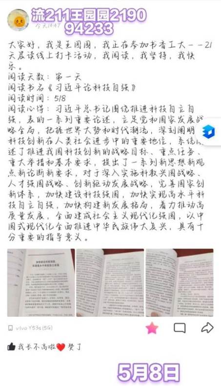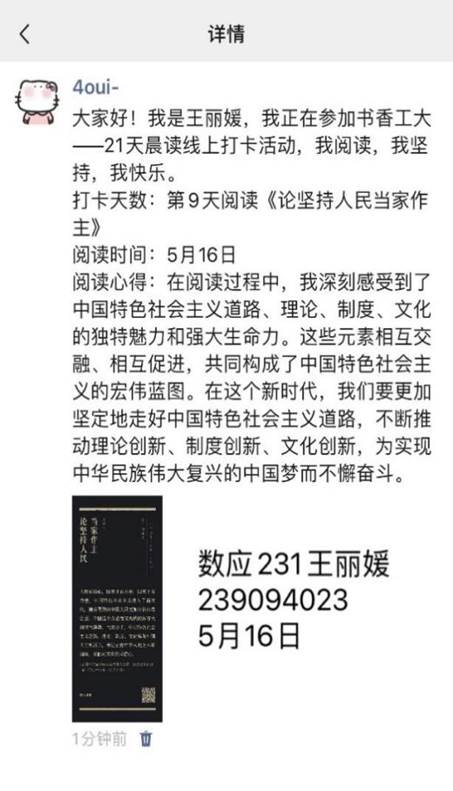 活动期间,各班级通过班会、团日活动开展书目推荐工作,重点推荐了《习近平与老员工朋友们》第二卷、《觉醒年代》等书目,动员同学们积极参与。活动采取线上线下相结合的形式进行,线上活动主要通过阅读打卡群、微信、QQ等网络平台上进行打卡,每天分享自己的阅读感悟;线下活动以员工自主阅读、小组分享读书心得为主要形式,活动持续开展近三周。活动结束后,公司将根据参与者的打卡次数、阅读时长以及阅读心得的质量,精选部分优秀心得进行宣传展示。