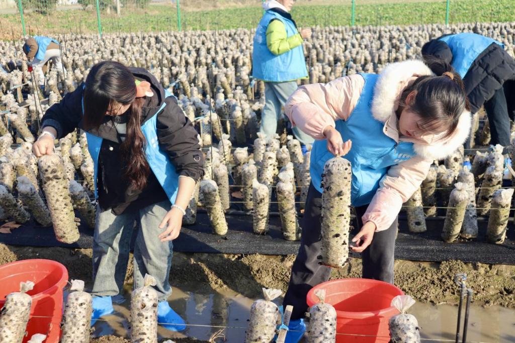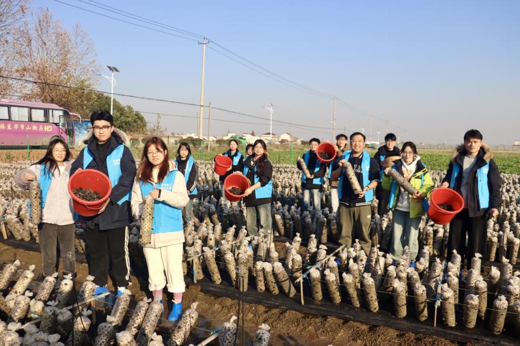 在兴圩村种植专业合作社,驻村第一书记黄宁辉向员工们介绍了木耳产业种植、开心菜园项目建设在助力乡村振兴,帮助农民增收方面的效用发挥,加深同学们对农村农事的了解。劳动实践中,师生党员一同走进田野,捧起菌棒,与当地村民共同参与了木耳、蔬菜的采摘与浇灌工作,在田间地头上了一堂生动的劳动教育实践课。