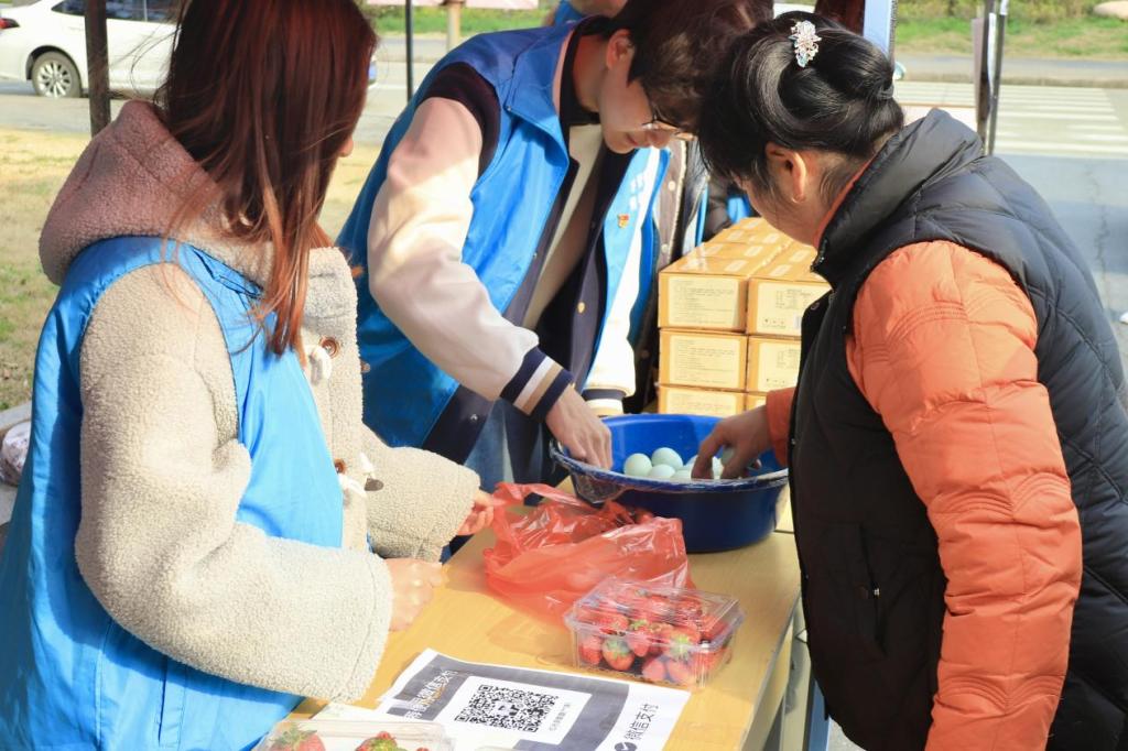 活动中,党员志愿者们热情地向过往的师生推荐黄花菜、鸡蛋、食用油、锅巴、蔬菜、水果等农产品,耐心解答消费者的疑问。“我是去年在兴圩村村部参加入党宣誓的一名预备党员,志愿月能够在校园里参加助农销售的党日活动很激动,感觉又重新回到了在兴圩村帮助农民采摘木耳的时候”,工业工程221班余家进在活动中说道。