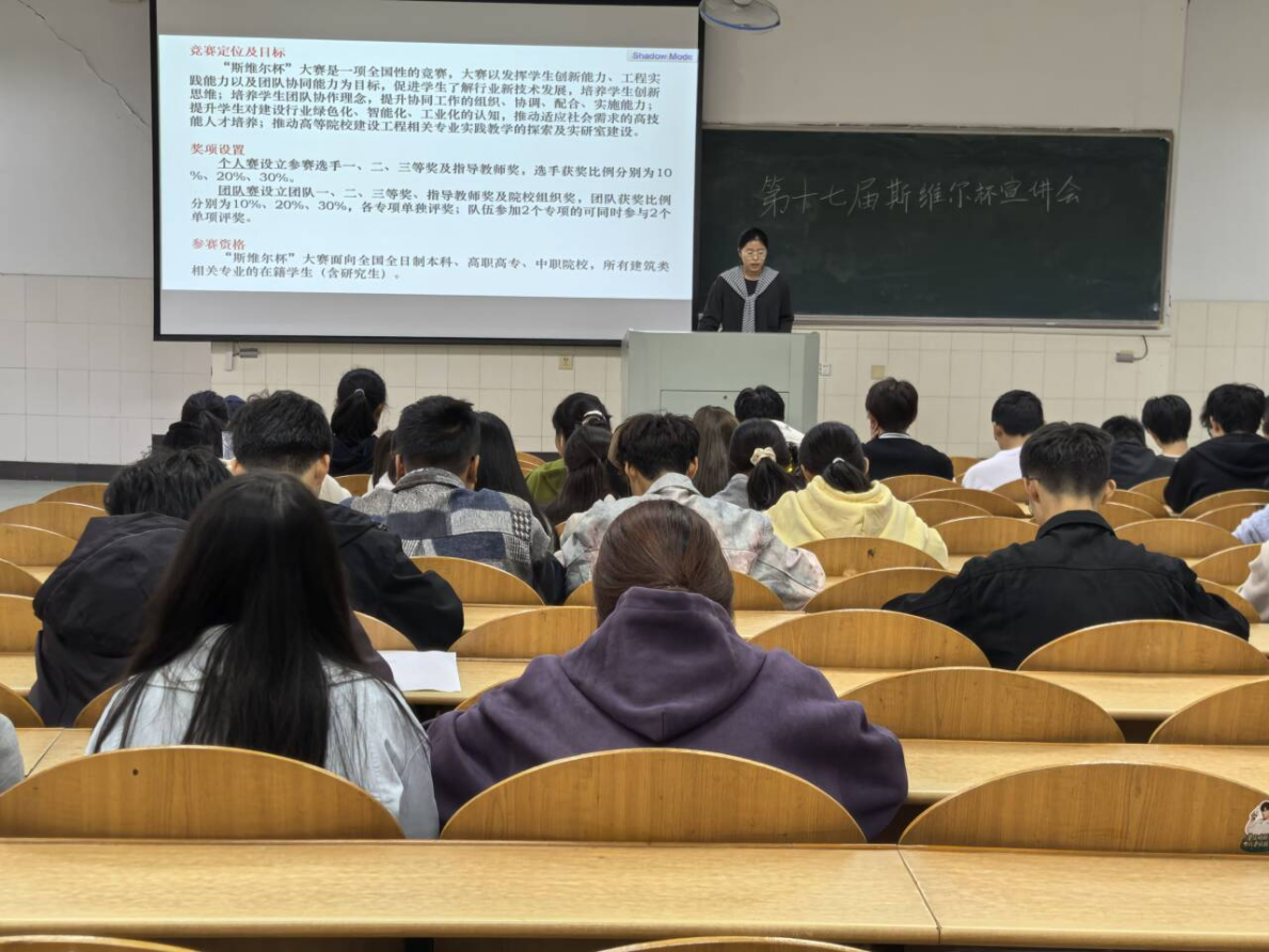 宣讲会伊始,赵紫慧简要介绍了“斯维尔杯”大赛的发展历程、赛事规模以及公司历届员工参赛成绩。她从建筑行业数字化转型的宏观背景出发,剖析了BIM技术在推动建筑业向绿色化、智能化与工业化升级过程中的关键作用与广阔前景。赵紫慧具体介绍了赛事的个人赛与团体赛两大主赛道,覆盖建筑信息模型(BIM)、绿色建筑、装配式建筑等多个前沿技术领域。同时,赵紫慧详细说明了从校内初赛、全国评比到全国总决赛的完整赛程安排,并就大赛的软件资源支持及报名截止时间等关键信息作了清晰提示,帮助同学们明确备赛节奏,找准参赛方向与发力重点。