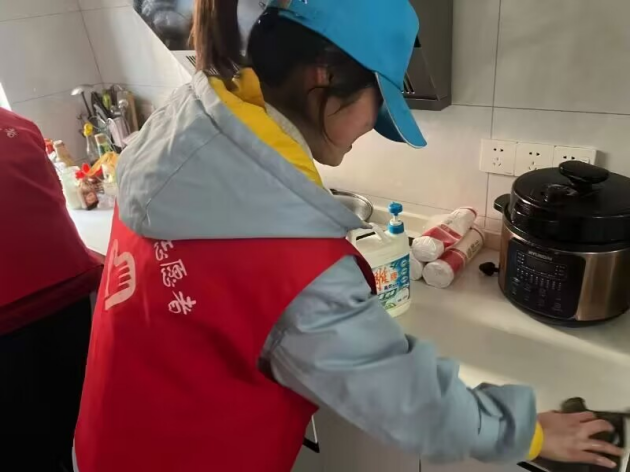 图为志愿者帮助居民打扫厨房。中国青年网通讯员 张奇 摄