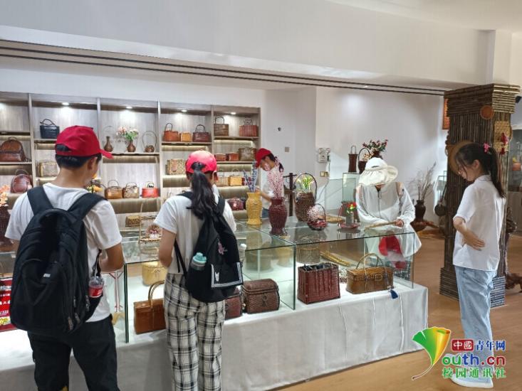 图为实践队员参观竹编展示馆,观赏精美的竹编作品。中国青年网通讯员周全球供图